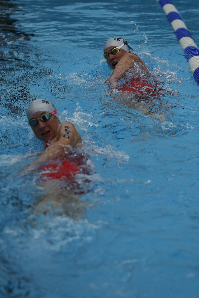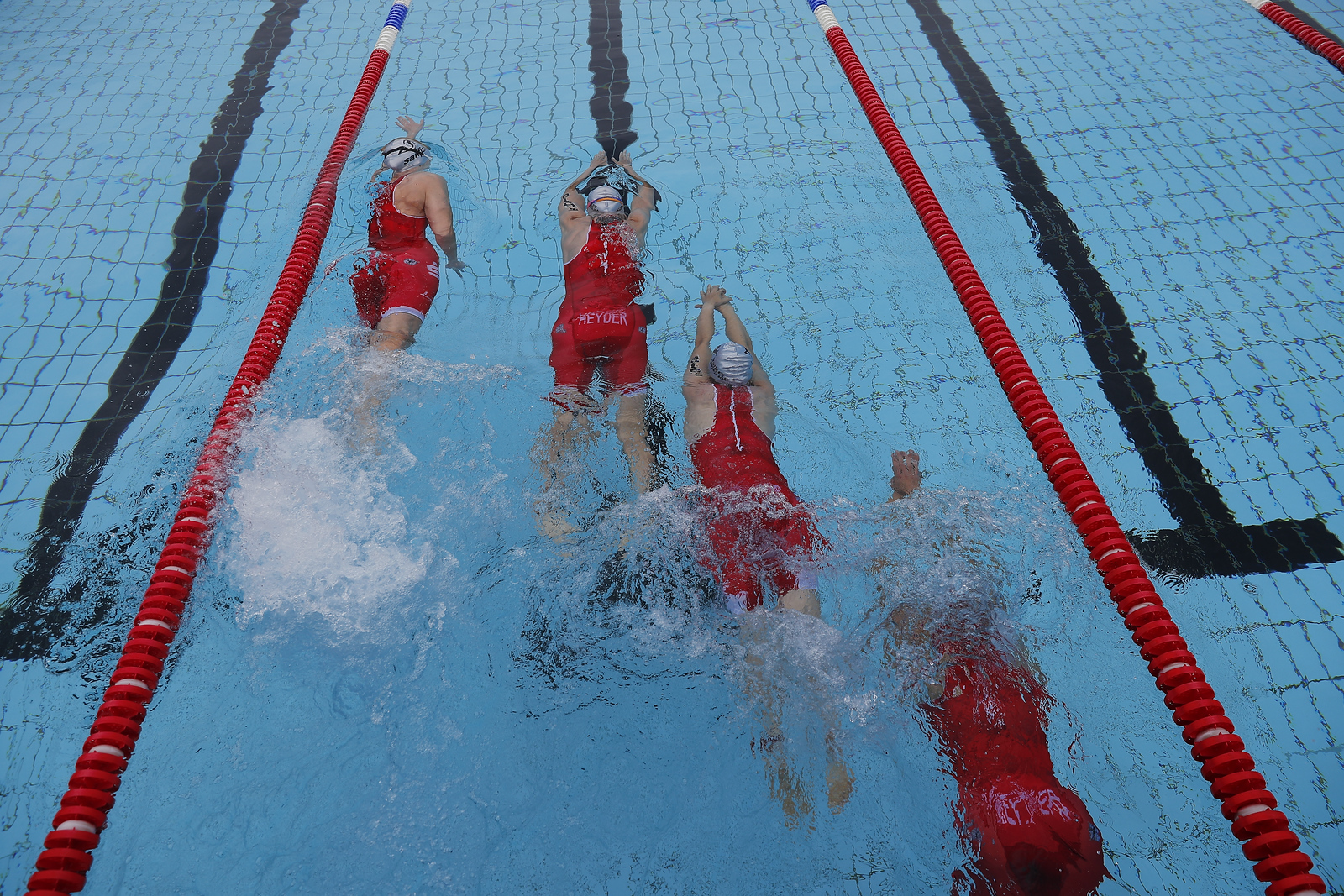 Während die Herren noch auf dem Rad ihre zweite Runde drehten, wurde es für die Frauen langsam ernst. Aufgestellt war das Frauenteam mit zwei Neuzugängen: Anna-Maria Dietze, eine Skilangläuferin, die auch mal Sport im Warmen machen möchte, sowie Carolin Meyer, eine erfahrene Triathletin sowohl auf den kurzen Distanzen als auch auf der Halbdistanz. Zusätzlich wurden die beiden unterstützt durch die im letzten Jahr in den Ligabetrieb eingestiegene Paulina Buresch und Anna Heyder, eine der Frauen im Verein mit der längsten Bundesligaerfahrung. Nach Platz 4 in der vergangenen Saison für das Dresdner Spitzen Team starteten sie um 11:42 Uhr auf Bahn 3 (Team Thüringen (Platz 3) war in die 1.Liga aufgestiegen). Anders als bei den Herren sind sich die Frauen nach 8 min, als das nächste Frauenteam zu Wasser gelassen wurde, nicht ins Gehege gekommen. Bei den Dresdnerinnen gab es im Waser mehrmals einen Führungswechsel zwischen Paulina und Anna.