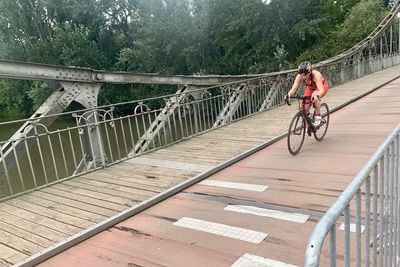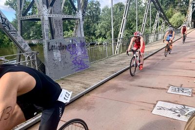Als erste von uns musste Marleen um 9:00 Uhr an den Start. Geschwommen wurde in der Saale, die zu diesem Zeitpunkt aber noch recht frisch war, weshalb der Neo angezogen werden konnte. Nach den 750 Meter, die mit der Strömung und gegen die Strömung geschwommen wurden, kam Marleen dicht gefolgt von Flavia (SC Chemnitz Triathlon) aus dem Wasser. Dann ging es auf die 20 Kilometer Rad-Strecke.