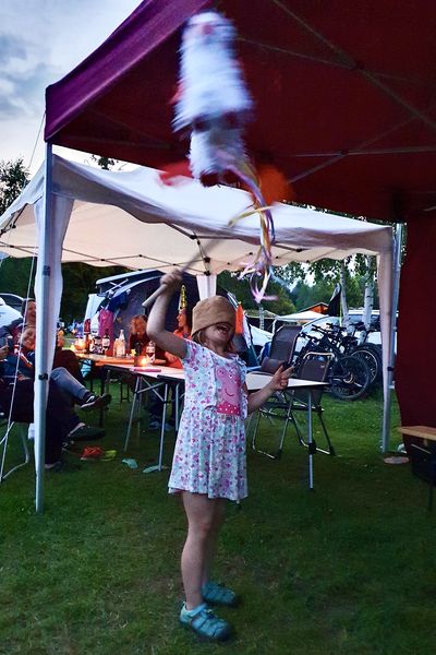 3. Charlotte und das Einhorn: Zu einem von Lydias Geburtstagsgeschenken zählte auch eine Piñata - ein Einhorn aus Pappmaschee in dem Süßigkeiten versteckt waren. Charlotte durfte sich: natürlich mit verbundenen Augen und mit einer Schaufel bewaffnet, an der Piñata probieren und versuchte, wild um sich fuchtelnd, das Einhorn runterzuschlagen. Ein Spektakel, bei dem kein Auge trocken blieb. Herrlich!