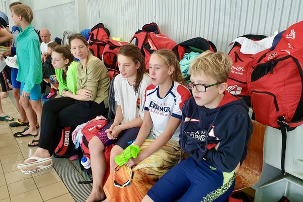 Als erstes haben wir noch kurz vor der Schwimmhalle gewartet, bevor wir reingegangen sind, um uns einen guten Platz für Rucksäcke und Co zu beschaffen.