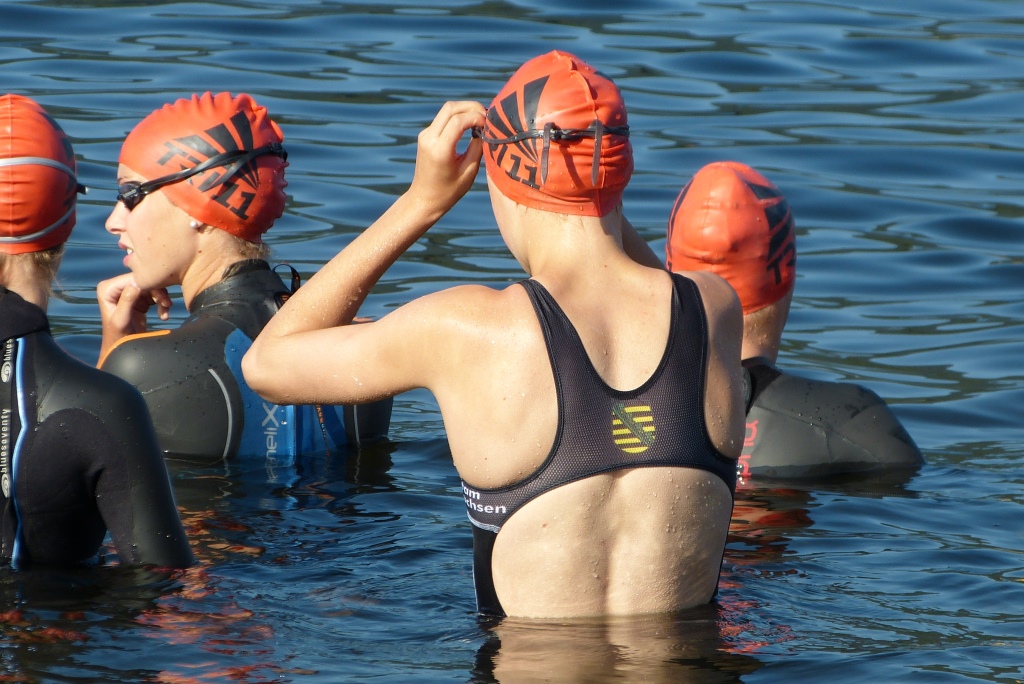 Danach startete in derJugend A Anton bei männlich und Maria und ich (Anne) bei weiblich. Maria und ich schlugen sich ganz gut im Schwimmen und kamen im Mittelfeld und somit in der Verfolgergruppe aus dem Wasser. Diesmal herrschte generelles Neo-Verbot.