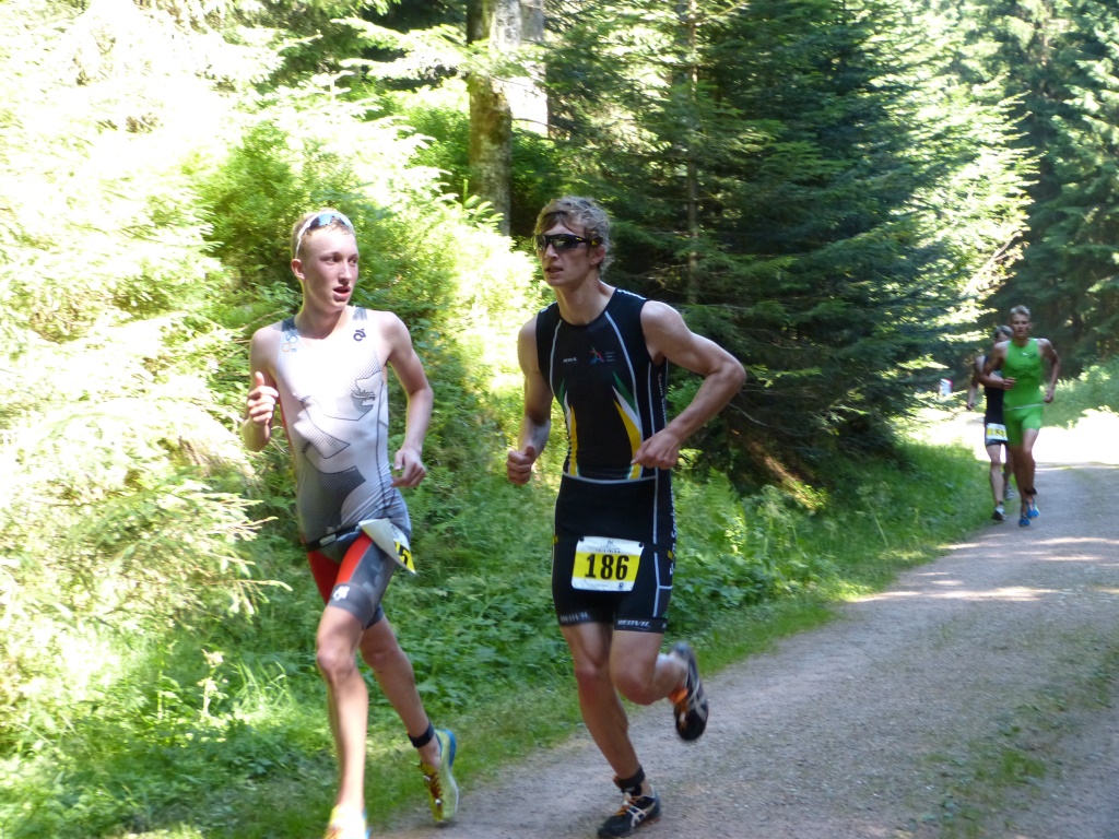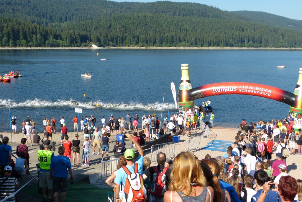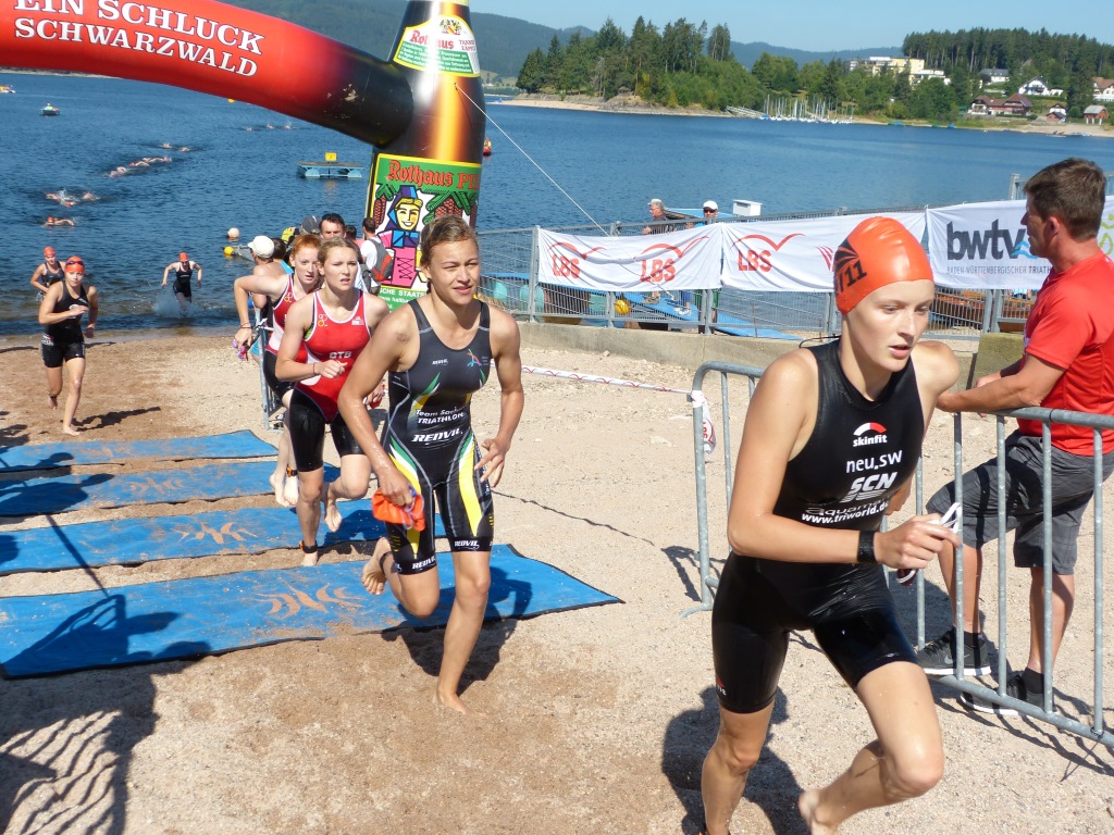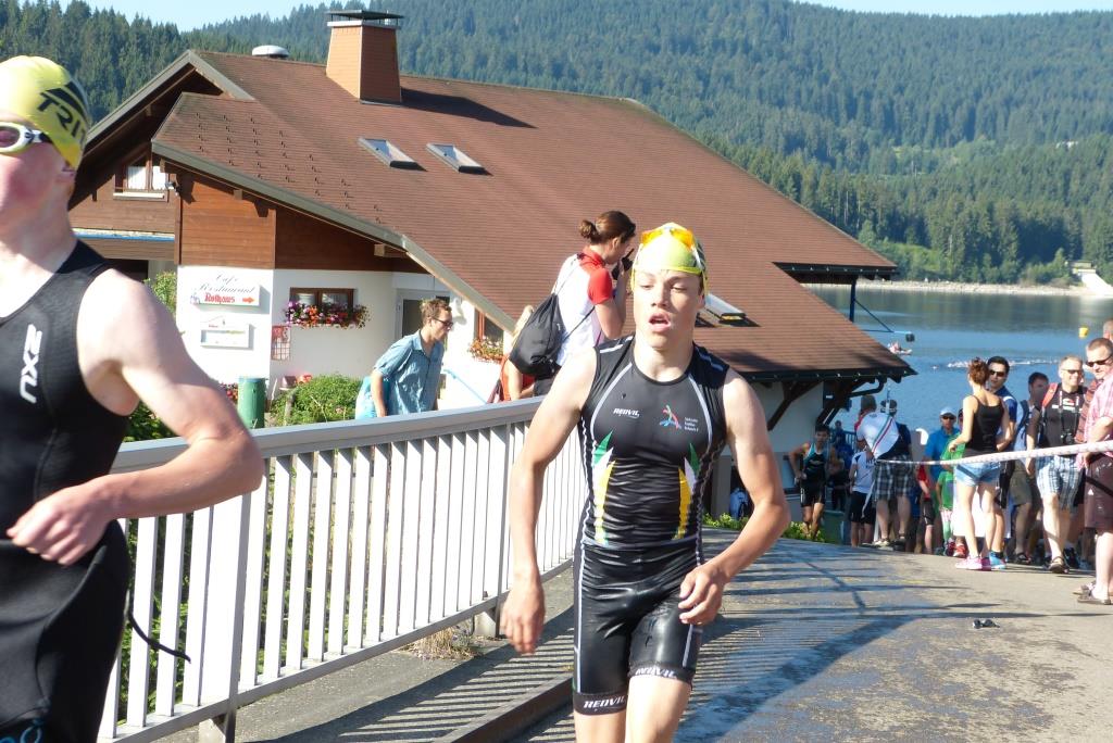 Amy startete in der Jugend B weiblich und somit nur 5 min hinter Philipp, was zur Folge hatte, dass beide Gruppen ungefähr gleichzeitig auf der Strecke waren. Das Wasser im riesigen Schluchsee war 21,5°C warm, so dass Neoschwimmen gerade noch so erlaubt war und viele Sportler der Jugend B nutzten dies auch.
