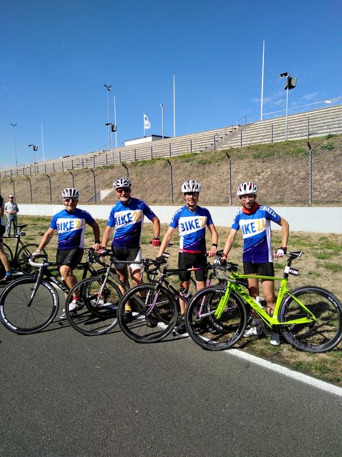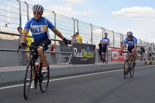 ...deshalb hatten wir in diesem Jahr zum VELOFONDO auf der Autorennstrecke in Oschersleben ein 4er-Team gemeldet. Dabei handelt es sich um ein 24h-Radrennen, welches man einzeln, als 2er, 4er oder 8er-Team machen kann. Am 8. September war es soweit, unser Team, bestehen aus den TV-Dresden Mitgliedern Bruno und mir, sowie meinem Bruder Wilfried (Potsdam) und Brunos Schwager Wieland (Magdeburg) standen am Start. Als Betreuer hatten wir Thomas aus Cottbus, der gern selbst gefahren wäre, aber ein zweites Team haben wir nicht komplett bekommen. Vor dem Start war mir etwas mulmig, 24 Stunden klingt verdammt lang… Um 14.00 Uhr nach einer neutralen Einführungsrunde ging es los. Die Rennstrecke ist 3,696 km lang, die Kurvenradien sind so, dass man ohne Bremsen durchfahren konnte. Wir hatten uns zu einem 30-minütigen Wechsel geeinigt, die meisten anderem Team wechselten stündlich. Zum Wechsel mußte man die Strecke verlassen und in die Boxengasse fahren, dort galt ein Speed-Limit. Der nächste Fahrer hatte dann in der Regel den Anschluß an die Gruppe verloren, mußte reintreten bis er wieder ran war oder auf eine schnelle Gruppe von hinten warten. Das hat aber nicht immer geklappt, zweimal mußte ich 30 min allein fahren, das war dann schon hart. Dafür ging es im Windschatten im Pulk schon wesentlich besser.
