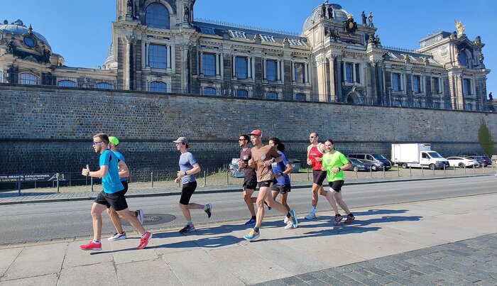 Dem Königsufer folgend unterschritten wir die Carolabrücke und die Augustbrücke. Ach, herrlich. Dieser Blick auf die Altstadt. Einmalig schön! Ob die Athlet:innen das beim abschließenden Halbmarathon in der Mittagshitze ohne Schatten auch so sehen werden? Wir sind uns sicher :-D Am Milchpavillion hieß es scharf rechts und ab zum Fototermin an den Canaletto-Blick! Klick, klick. “Ich habe jetzt ein paar gemacht. Ich hoffe da ist etwas dabei.” Über die (für den Ironman) frisch sanierte Augustbrücke liefen wir auf das Schloss zu. Unter dem Georgentor war es kurz mal etwas frisch. Hier könnte am Renntag eine besondere Stimmung herrschen. Taschenberg und Sophienstraße folgenden befanden wir uns nach ein paar weiteren Schritten am Theaterplatz. Hier wird man dann auf Runde 2 und 3 bzw. den Zielkanal einbiegen. Alle Experten sind sich einig: Das ist eine sehr schöne Laufrunde!