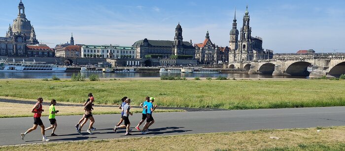 Zur Besichtigung der Laufrunde trafen wir uns am folgenden Sonntag zu früher Stunde, um nicht zwischen den ganzen Touris und rastlosen Rentner in der Altstadt und am Elberadweg Slalom laufen zu müssen, mit denen spätestens ab 10 Uhr in großer Zahl zu rechnen war. Mit 9 Menschen war diese Runde wie erwartet kleiner. Vom geplanten Wechselgarten in der Flutrinne folgten wir der Pieschener Allee im großen Bogen um die Sport- und Spielplätze im Ostragehege. Kurz vor dem Sportgymnasium hieß es Wende und zurück Richtung Marienbrücke. Hier ging es auf dem Elberadweg unter der Augustbrücke an der weißen Flotte vorbei gen Albertbrücke. Auch diese ließen wir über uns vorbeiziehen. Am Ende des Flohmarkts stapften wir rechter hand zum Käthe Kollwitz Ufer hoch, um via Albertbrücke die Elbseite zu wechseln. Nach einem kleinen Turn waren wir wieder auf dem Elberadweg.