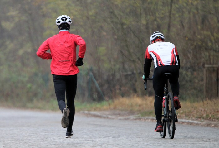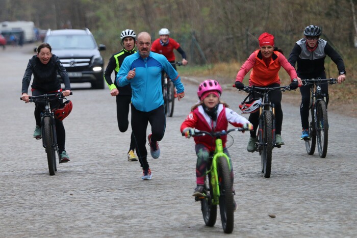 ... um im Abstand von fünf Minuten auf die 17,7 km lange Strecke zu starten. Die Mannschaften bestanden aus zwei bis vier Menschen unterschiedlicher Alters- und Leistungsklassen. Bei strahlendem Sonnenschein und herbstlichen Temperaturen bewegte sich je ein Mannschaftsmitglied laufend fort, während die übrigen Mannschaftsmitglieder auf Rädern versuchten hinter her zu kommen. Die Wechsel waren genauso individuell, wie die Laufgeschwindigkeiten und konnten frei eingeteilt werden. Während einige Mannschaften mit Messern zwischen den Zähnen unterwegs waren, ließen es andere besinnlicher und gemütlicher angehen. Die Runde führte über den Kannenhenkel, über die Hofewiese und den Prießnitzgrund zurück Richtung Marienallee.  Landschaftlich und atmosphärisch immer auf höchstem Niveau, war die Strecke bis zur Hälfte auch etwas hubbelig.