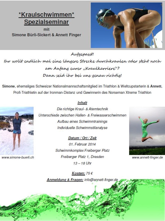 Da die Plätze des vereinseigenen Schwimmseminars nicht für alle Interessenten genügt haben, wollen wir euch auf das Angebot von Simone und Annett aufmerksam machen.