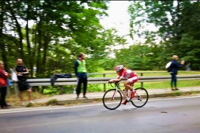 Tatsächlich war das Maria, sodass Marleen mit einem kleinen Vorsprung auf die Radstrecke gehen konnte. Kurz danach kamen dann schon die ersten Einzelstarter, die mit ihren Zeitfahrrädern natürlich Vorteile auf der fünf Kilometer langen Wendepunktstrecke hatten, welche vier Mal gefahren werden musste.