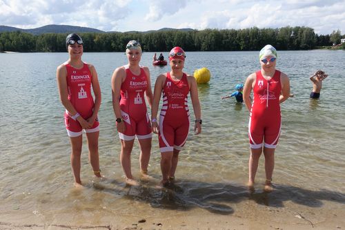 ... denn an diesem Tag fuhren Hannah, Marleen, Lydia und ich mit unseren Familien in die Tschechei zum Cross-Triathlon. Als wir am Kristina-See in Hradek ankamen, warteten wir noch auf Lydia. Dann sind wir zum Check-Inn gegangen und breiteten unsere Decken aus.