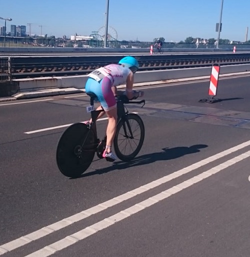 8:55 Uhr Wettkampfeinweisung. und dann ging es noch mal für 5 min in den Rhein. Pünktlich 9:10 Uhr fiel der Startschuss. Ich erwischte einen guten Start. Als es auf die erste Boje zuging verengte sich das Startfeld und ich bekam viele andere Hände und Füße zu spüren. Ruckzuck waren die 750m zurückgelegt (laut Garmin 870m), nun führte eine lange Treppe und eine nicht enden wollende Wechselzone zum Rad. Dort schnell Helm auf und Startnummer um und ab ging die Post. Die Radstrecke war klar markiert, so dass meine anfängliche Angst völlig unbegründet war. Es ging über zwei Rheinbrücken, wo der Wind stark von der Seite wehte, entlang dem Rheinufer zum Messegelände und wieder zurück. Ich verlor sicherlich durch meine defensive Fahrweise auf den An- und Abfahrten der Brücke einige Sekunden, aber ich wollte heil ankommen. Stürze auf der Radstrecke waren keine Seltenheit.