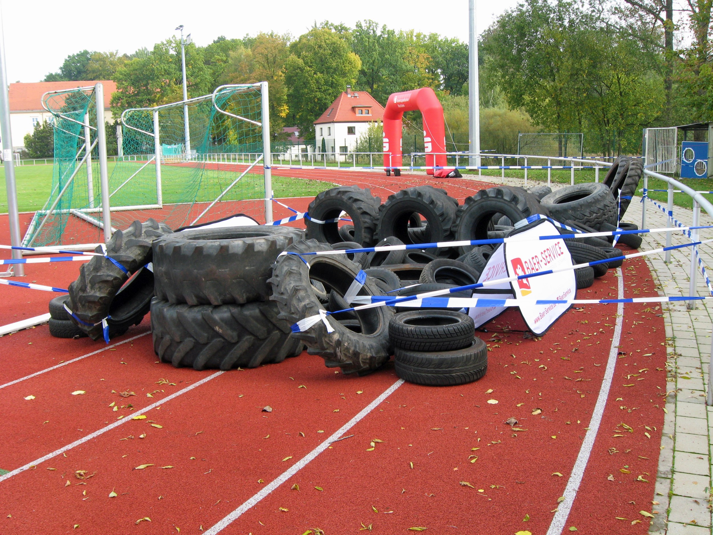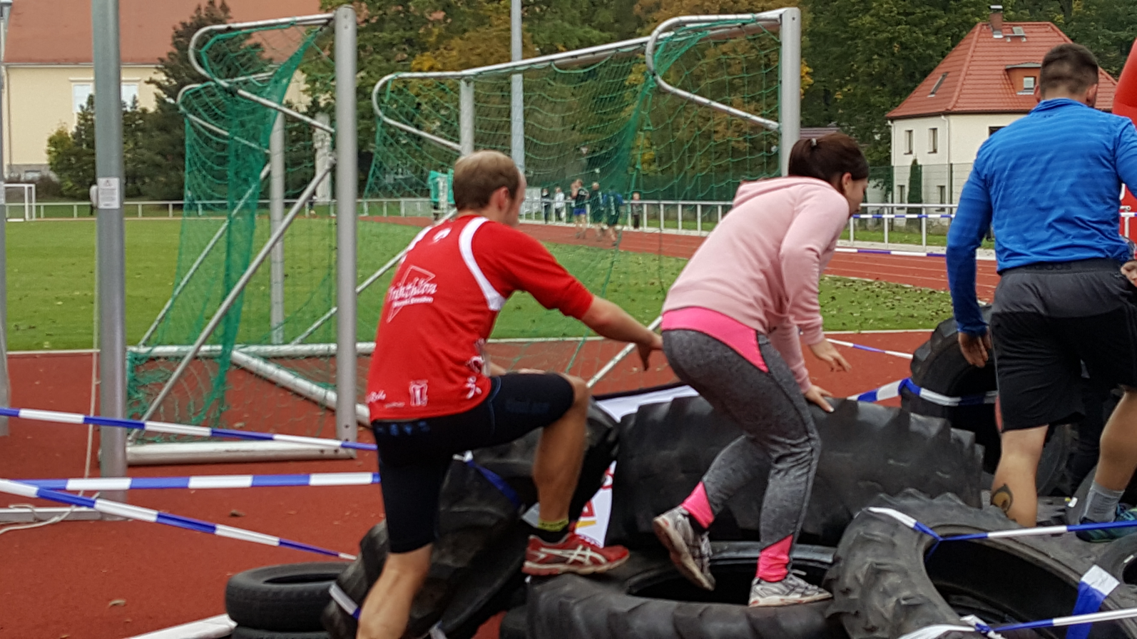 So ging es dann auch an den Start in Bischofswerda. Insgesamt kamen 460 Sportler zusammen, wobei die meisten sich für die einfache 4 km Runde entschieden hatten. Zuerst starteten die Kinder über 900 Meter mit Hindernissen, welche auch die Erwachsenen überwinden durften. Dann ging es schon mit den 8 Kilometerläufern los. Gestartet wurde dabei im Abstand von 5 Sekunden. So sollte der Stau vor den einzelnen Hindernissen minimiert werden. Ich stand so ziemlich in der Mitte des Feldes und konnte den ruhigen Start vieler Teilnehmer beobachten. Im Gegensatz zu normalen Laufveranstaltungen ließen es viele langsam angehen. Dann ging es auch für mich auf die Strecke. Bis zum ersten Hindernis (ein paar große Reifen auf der Bahn) waren es ca. 150 Meter und hier überholte ich schon mal zwei Sportler, um etwas Platz bei der ersten Klettereinlage zu haben. Nach den Reifen ging es durch Schaum über Schaumstoff zu stark gehockten 100 Metern und von dort direkt zum Labyrinth. Hier musste man nur schnell zwischen Bauzäunen seinen Weg hindurch finden.