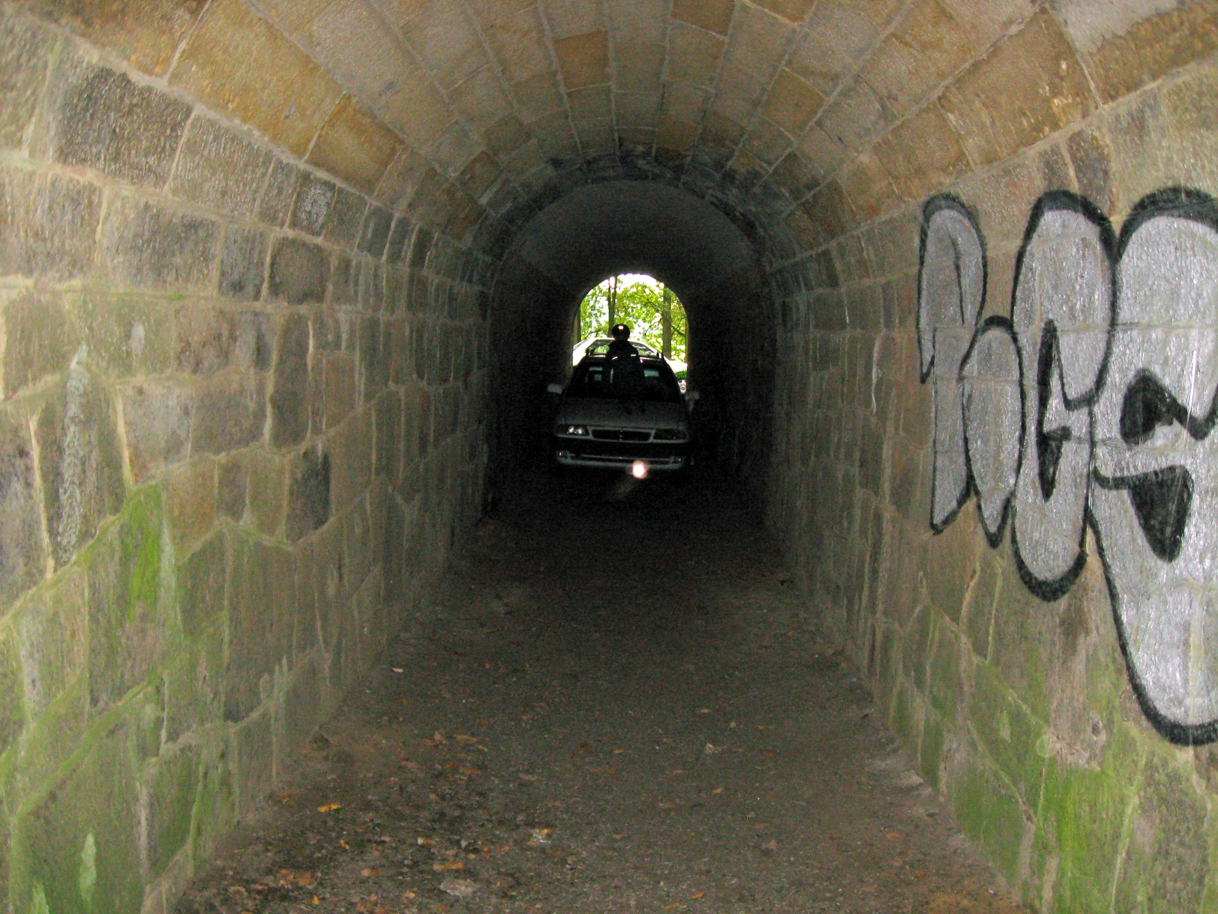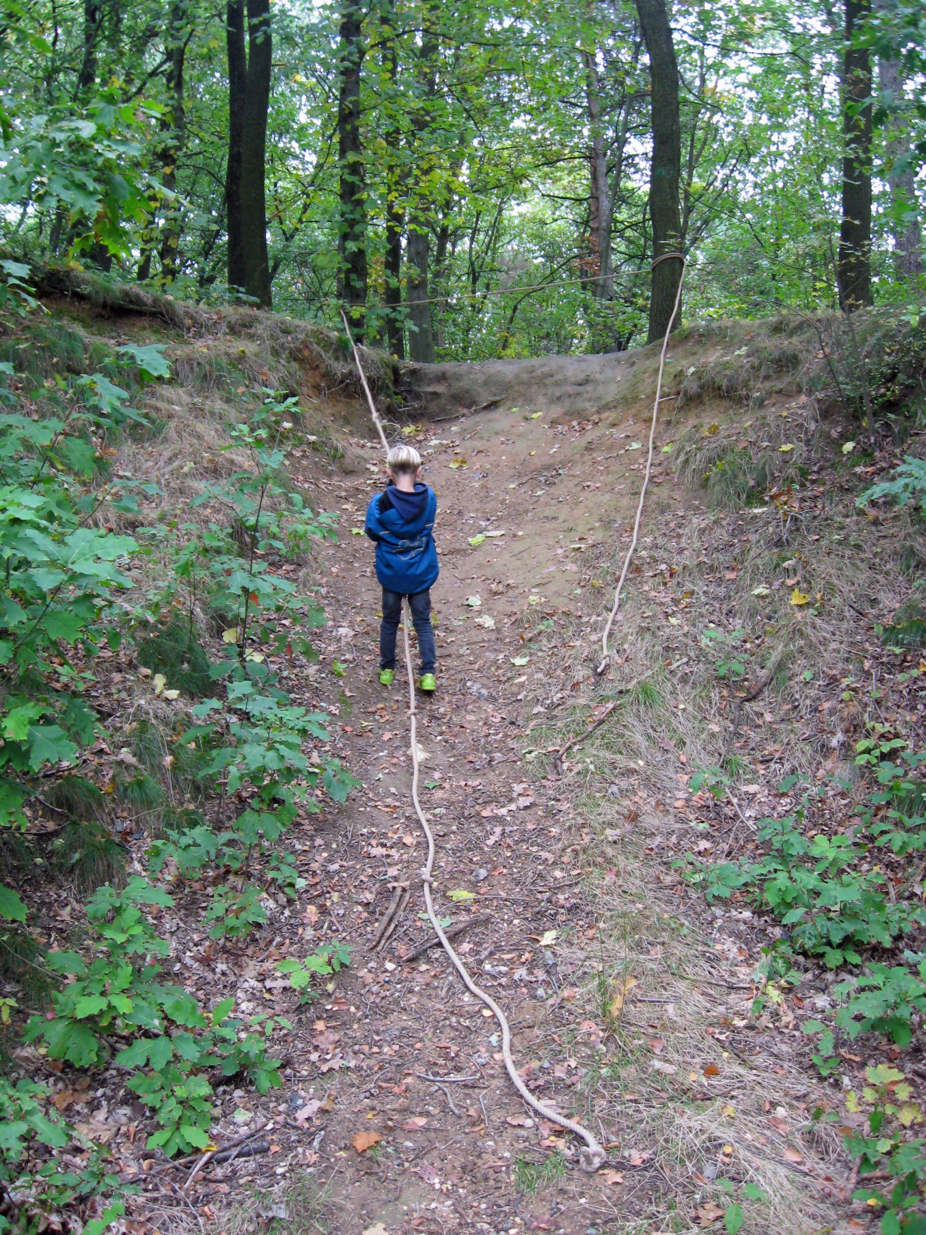 Als nächste Hindernis kam ein kleines Klettergerüst zum hochkrabbeln und von oben runter springen und ein paar Meter danach ging es einen steilen Anstieg nach oben. Ein paar Seile zum Festhalten waren vorhanden, aber mit etwas Schwung ging es auch ohne. Weiter gingen es durch den dunklen Wald, wo völlig unverhofft ein Bär aus dem Gebüsch kam, also schnell weiter, der soll mal die langsameren Starter fressen. Als nächstes Hindernis wartete eine Kombination aus gestapelten Paletten zum überqueren und Hürden zum unterqueren. Nach wieder ein paar entspannten Laufmetern stand ein Auto quer über dem Weg. Zum Glück waren die Türen offen, so konnte man schnell durchkrabbeln, um dann in einem mit einer Abdeckplane zugehängten Tunnel zu stehen. Damit man seinen Weg nicht so schnell raus findet wurde zusätzlich ordentlich Rauch erzeugt und in der Mitte ein weiteres Auto platziert. Zwei Läufer vor mir blieb eine Frau stehen, um sich zu orientieren. Ich konnte zum Glück noch rechtzeitig bremsen, sonst hätte es ein weiteres Hindernis gegeben. Nach dem Tunnel stand zum Abschluss ein weiteres Auto, welches man über die Motorhaube gut überwinden konnte.