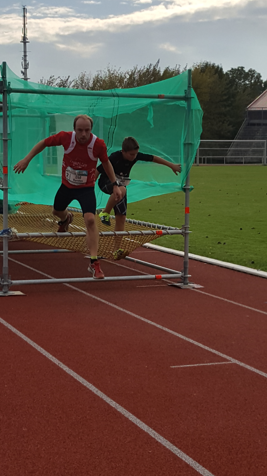 Als nächste folgte ein Haufen Reifen unter einer Brücke, eine Container mit Schaumstoff (und ein paar komischen Seilen drüber) und dann eine Vielzahl an Hürden. Gefühlt haben mich diese Hürden am meisten genervt und gerade in der zweiten Runde war ich froh, als diese vorbei waren. Dann ging es durch runde Löcher zurück auf den Sportplatz, wo nochmal zwei Hindernisse standen. Zum einen eine Netz zum gebeugten drüber gehen und zum anderen ein Gerüst mit tief hängenden Reifen. Schon war die erste Runde geschafft und ich durfte mich direkt nochmal an den Hindernissen versuchen. In der zweiten Runde mischten sich dann die 1-Runden-Läufer unters Volk, so dass der Stau an den Hindernissen etwas größer wurde. Jedoch konnte man bei den reinen Laufstrecken die Sportler einfacher überholen, da diese etwas langsamer rannten. Beim Sandsackschleppen war ein Joggen dann nicht mehr möglich, es blockierten einfach zu viele Fußgänger den Anstieg. Dafür konnte man Kinder beobachten, die verzweifelt versuchen den Sandsack irgendwie zu transportieren. Ich war fast versucht Ihnen den Sandsack abzunehmen. Vielleicht hätte man für die Kinder ein paar leichtere Säcke füllen sollen, oder aber die Altersgrenze etwas nach oben korrigiert. Die zweite Runde war auf jeden Fall schnell vorüber (wenn auch zeitlich etwas langsamer als die Erste) und mit einem kleinen Zielsprint war das Rennen Geschichte. Mit knapp über 40 Minuten und Platz 21 war ich total platt und auf jeden Fall zufrieden. Es war in Summe eine sehr schöne Veranstaltung, die jetzt schon mal im Kalender für 2017 vorgemerkt ist. So kann ein gelungener Saisonabschluß aussehen!