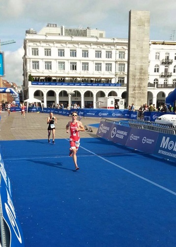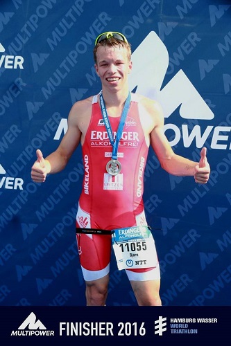Der Wecker klingelt, es ist 04.20h, also beste Zeit um aufzustehen. Frühstücken und dann auf zur U-Bahn. Danach direkt weiter zum Check-In und den Wechselplatz einrichten. Die Bedingungen waren traumhaft. 17 °C und leichter Regen, so wünscht sich das jeder Triathlet. Viel Zeit war nicht mehr, also rein in den Neoprenanzug und auf zum Start. 3, 2, 1, Go! Schnell anschwimmen und in den Rhythmus finden, soweit lief alles gut. Das Feld war sehr schnell weit gestreckt und ich kam gefühlt ganz gut voran. Nach ein wenig Badespaß in der Alster war dann der Ausstieg in Sicht. Raus aus der Suppe und ab zum Rad. Der Weg dahin war ewig lang, ein guter halber Kilometer barfuß im Neo bis zum Rad rennen, eine ganz neue Erfahrung. Als 19. meiner Welle kam ich aus dem Wasser, soweit ganz ok, denn jetzt kommt ja meine stärkste Disziplin – das Radfahren.
