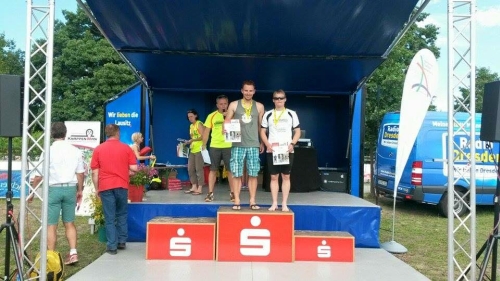 Beim Wechsel zum Laufen versuchte ich vergeblich meine Socken anzuziehen und nein, es funktionierte nicht. Mein Trainer Reiner sah es auch noch. Die Laufstrecke verlief auf einer Art Radweg durch Bäume, aber trotzdem war kaum Schatten zu sehen. Die Sonne brannte von oben herab. Die Kühlung vom Wasser hielt keine 2km an, sodass ich immer Wasser und Cola bei der Verpflegung bestellte. (Ich habe es ihnen zugerufen.) Nach der 2. Runde wussten sie es schon. Lieben Dank für die tolle Verpflegung. Bei der Hitze hätte ich mir beim Wendepunkt noch eine gewünscht. An den Verpflegungspunkten drosselte ich das Tempo um wenigstens 1-2 Schlucke zu nehmen, bei gefühltem 170-175 Puls. Das Wasser entleerte ich gleich über den Kopf. Zwischendurch sah ich immer die TV Dresdner, die feuerten mich ordentlich an, obwohl sie hinter mir lagen. Lieben Dank! Pauline hat wieder mal eine geniale Laufzeit trotz der Hitze hingelegt. Susi Pawel hat eine verdammt tolle Radzeit auf die Straße gelegt, sogar schneller als Simone Bürli, die Gesamtsiegerin der Frauen wurde. Nach 2:14:19 erreichte ich nun das Ziel und mein Ziel war erreicht: beste Schwimmzeit laut Uhr 22min, Radzeit unter 1:07 (gefahren 1:01), 10km Bestzeit, um die 45min ohne Wechselzone, die leider darin berechnet wurde, unter 2h 20min und das letzte Ziel, auf dem Podest zu stehen nach dem 3. Triathlon.