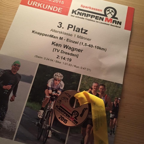 Danke Reiner für die Begrüßung im Ziel! Es war mein erstes Mal, dass ich taumelnd im Ziel angekommen bin. Pauline wurde insgesamt 3. Frau und verdiente einen Pokal. Susi erreichte Gesamt 5. Frau. Bei den Männern fuhr Rajko Sickert mit der 3. besten Radzeit zum 3. Platz in der Gesamtliste. Christian Schröter lag auf Platz 12 und ich auf Platz 18 von 184 Startern. Clemens das Rad fährt! Danke für den Zusammenbau! Danke an den Triathlonverein Dresden!
