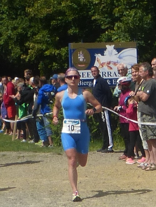 Der Senftenberger Aufstieg hat es in sich. Gefühlte km lang das Rad über stoppeligen Rasen schieben, um dann in einem Balanceakt auf groben Kopfsteinpflaster aufs Rad zu springen. Wer das schafft, hat 4 Radrunden mit einem nicht zu vernachlässigen Anstieg vor sich. Ich kam auf Platz 6 aus dem Wasser. Meine Taktik? Treten! Einfach nur drauf los und es brachte mich auf Platz 3.