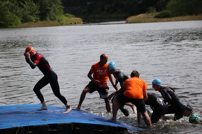 Es wurde in der Mulde, einem fließenden Gewässer, geschwommen. Dadurch herrschte am Wettkampfmorgen auch nur eine Wassertemperatur von 19,3 °C, also war der Neo erlaubt!