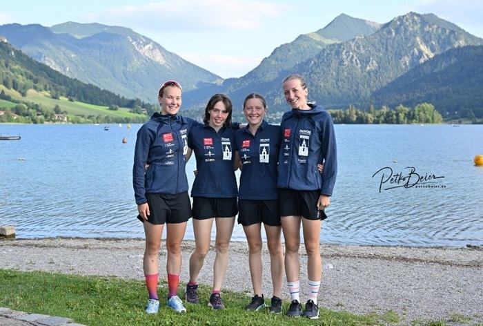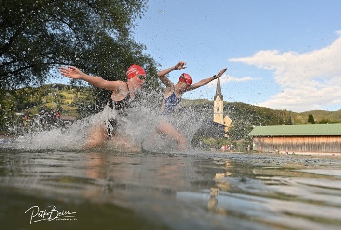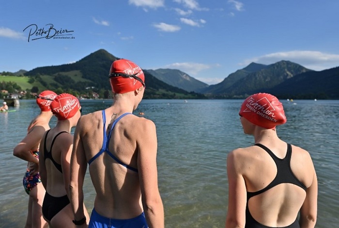 Nach dem Check-In schwammen und liefen wir uns noch ein. Die Zeit bis zum Start wurde immer weniger, mittlerweile waren es noch 15 Minuten. Emily bat mich ihren Einteiler zu zumachen. Aber was war das??? Der Reißverschluss war ausgehakt und aufgedröselt. Aaaah…! Ruhe bewahren. Kurz bevor Martin zum Spitzingsee gefahren ist meinte er, dass er Alex (Paulines Papa) einen Ersatzeinteiler gegeben hat. Also los zu Alex! Puh und zum Glück konnte er die Situation retten und klärte alles mit den Kampfrichtern ab. Wow das war nochmal spannend. Jetzt aber nichts wie los zur Startlinie, bevor das nächste Unglück passiert.