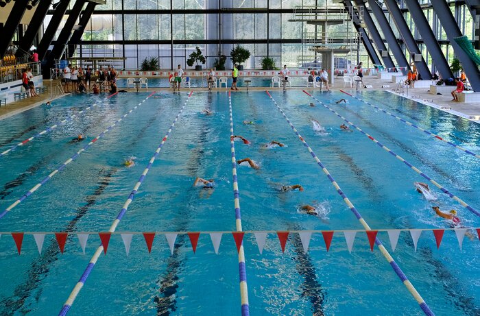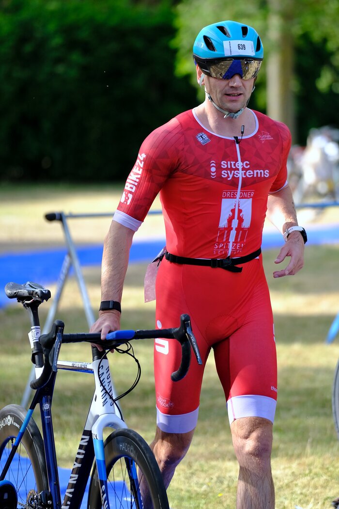 Die Rennleitung war glücklicherweise sehr entspannt und flexibel: Ich hab neue Aufkleber von der „96“ bekommen, die wurde nicht vergeben, und eine 5 wurde mit Edding davor gemalt. Problem gelöst. Da ich schon fast 1,5h vor Rennbeginn das Thema klären wollte, hatte ich nun also reichlich Zeit – das Ganze dauerte keine 10 Minuten. Ich war der Erste beim Einchecken und beim Abgeben der Beutel in den Wechselzonen. Wieder mal Erster, ich brauchte noch ein Erfolgserlebnis. Ich bin dann barfuß ein paar Streckenabschnitte der Lauf- und Radstrecke abgelaufen, gefühlt 5 mal in die Schwimmhalle und wieder raus, bis dann endlich mal was los ging.