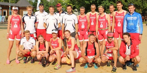 In diesem Jahr treten die Dresdner Triathleten mit ganzen vier Teams an: eine Frauenmannschaft, zwei Männerteams und ein Mastersteam. Nach einer gemütlichen Fahrt in guter Gesellschaft und dem üblichen Check-In Prozedere war alles angerichtet für den Showdown. Der Start steht kurz bevor und die Männergruppe in schwarzen Tarnanzügen formiert sich im Wasser. Die ersten Meter im Wasser waren diesmal ziemlich rau. Überall um mich herum versuchten alle übereinander zu schwimmen. Klappt meist nicht so gut, aber man kann es ja mal versuchen. Nach den ersten 100 – 200 m hatte sich das Feld entzerrt und gemeinsam mit Martin konnte ich ein gutes Tempo schwimmen. Zusammen mit Jens ging es aus dem Wasser raus über den blauen Teppich zum ersten Wechsel.