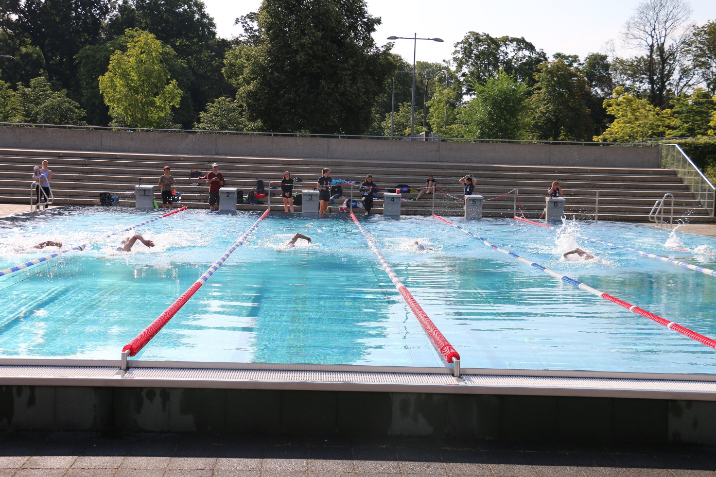 Am Samstag um 6.15 Uhr klingelte dann der Wecker, denn bereits um 8 Uhr sollte der erste Teil des Wettkampfes, das Schwimmen gestartet werden. 7.45 Uhr haben wir uns alle vor dem Georg-Arnold-Bad getroffen und um 8.00 Uhr sprangen wir für das Einschwimmen ins 22 Grad frische Wasser. Alle kämpften bis zum Schluss um jede Sekunde und die Fans (aka Männer-Team + Betreuer) am Beckenrand feuerten uns kräftig an. Als erstes schlug Sophie Schumann in einer Zeit von 10:07 min am Beckenrand an. Die nächste war Sophie Gießmann in einer Zeit von 10:44 min. Anna Harbo, die den Wettkampf in ihrer Heimat in Dänemark absolvierte, war auch bereits nach 10:31 min im Ziel.