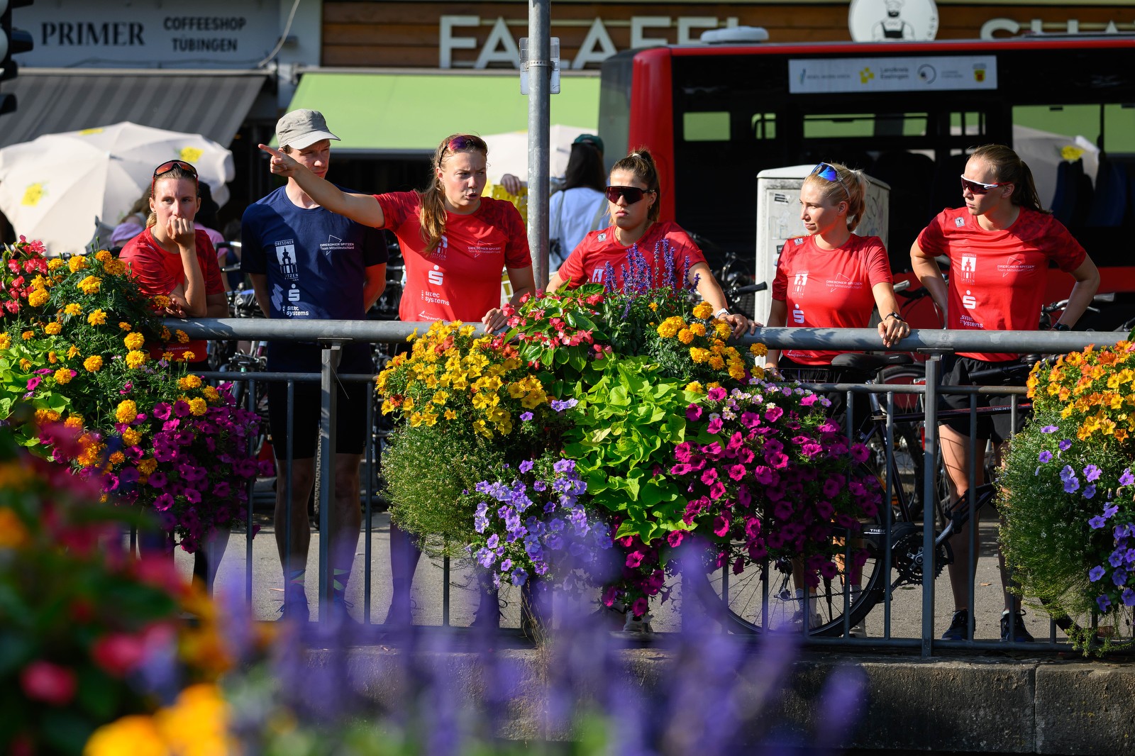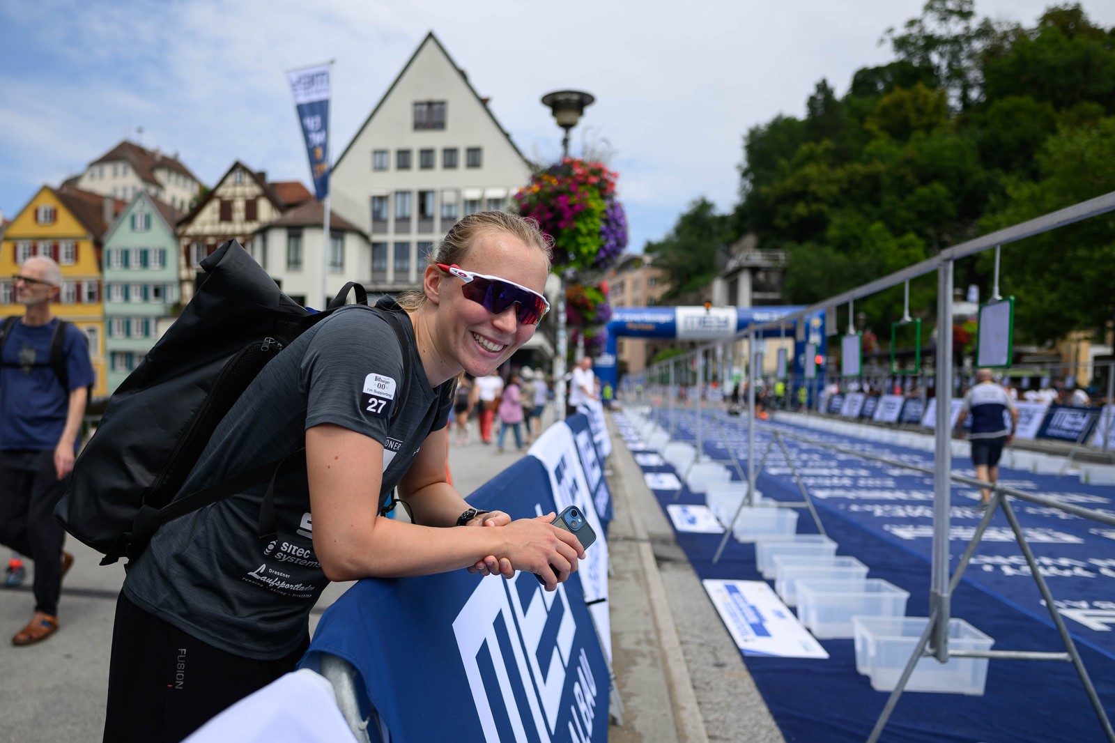 Woran ich mich am meisten erinnere vom Rennen in Tübingen? Vermutlich an die Blümchen, die Hitze der unerwartet bergigen Innenstadt und die Unsicherheiten, ob es nicht doch ein Duathlon (ohne Schwimmen) werden könnte. Linas nicht so heimliche Hoffnung wurde leider nicht erfüllt und so ging es los mit dem Schwimmen im Neckar. Ich war mit Martin diesmal als Betreuerin unterwegs. Es kribbelte zwar mächtig in den Fingerspitzen, aber ich fand mich gut in die Rolle ein und versuchte aus Starterinnen-Perspektive an den richtigen Stellen für Lena, Lina, Sophie S. und Sophie F. da zu sein. So ging es mit meiner gelben Medienweste (, die ich aus Style-Gründen zwar nicht anhatte,) los.