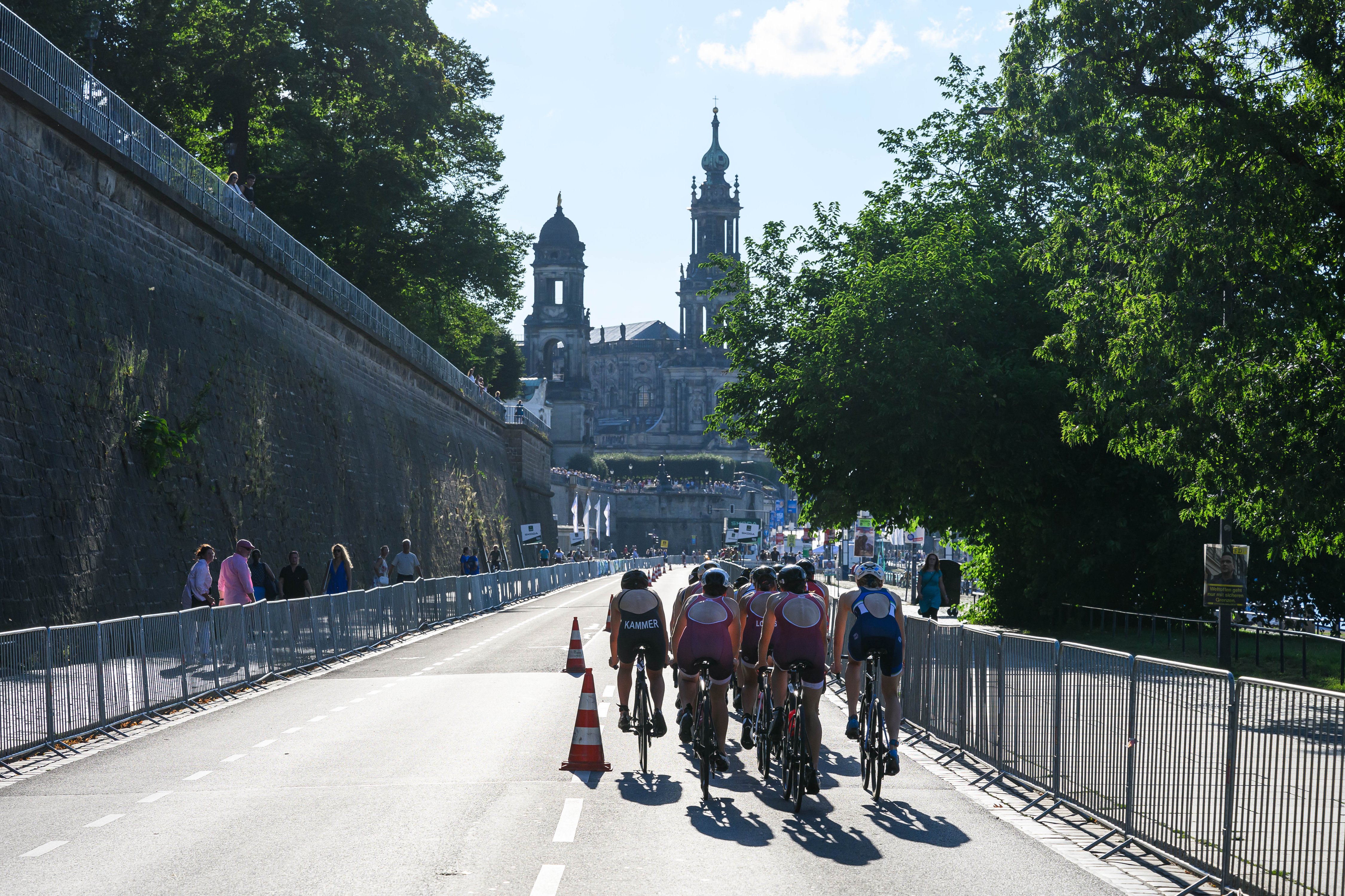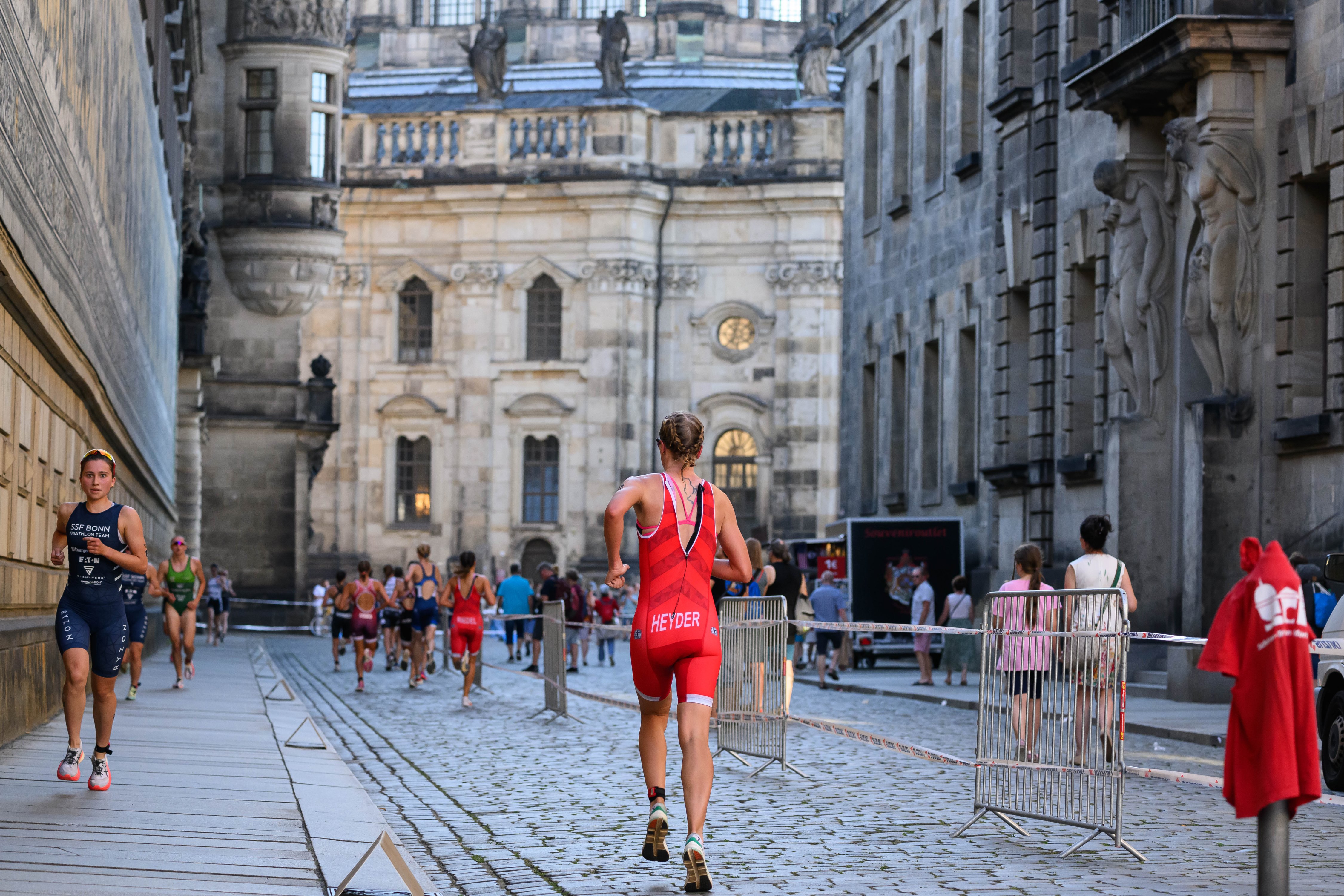 Mit Caro, Lena, Anna und meiner Wenigkeit gingen wir an den Start. Mit dem besten Support im Rücken und familiären Atmosphäre am Vorabend, ging es mit den Rädern zum Wettkampfgelände. Durch die späte Startzeit blieb viel Zeit für einen Auftaktlauf, Taktikbesprechung und individuelle mentale Vorbereitung. Zu letzteren gehörte auch fleißiges Olympia-Schauen, um die richtige Motivation zu finden. Zunächst checkten wir an der Semperoper ein, bevor es dann zur ersten Wechselzone am Alberthafen ging.