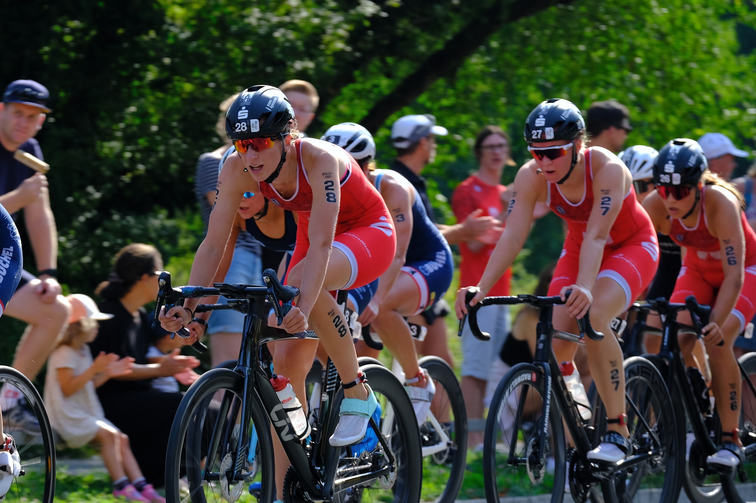 Nach einem echt zufriedenstellenden Schwimmen ging es aufs Rad, wo zunächst Caro in einer dreiköpfigen Führungsgruppe ihr Ding machte, ich in der zweiten und Lena und Anna in der dritten Gruppe zu finden waren. Der Abstand meiner Gruppe nach vorne wurde größer, während Gruppe zwei und drei zusammenfuhren, sodass es im Hauptfeld auf eine Laufentscheidung hinauslief. Taktisch clever, aber mit wackligen Beinen gelang es mir als erste der Gruppe aus der Wechselzone zu laufen, was leider nicht von langer Dauer war. Die Laufstrecke hatte es echt in sich. Der Untergrundwechsel, die kurzen Anstiege und die ewig lange Gerade auf der heißen Straße machten mir echt zu schaffen. Caro zog souverän ihr Rennen durch und wurde famose Zweite. Ich konnte mit Platz 17 auch an meine Leistung im Kraichgau anknüpfen. Lena und Anna, die auf dem Rad relativ viel gearbeitet haben, liefen das Rennen solide auf den Plätzen 30 und 31 zu Ende.